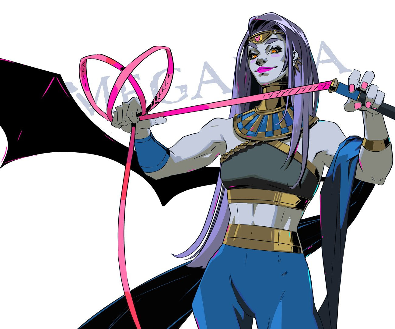 Megaera exudes a stern but alluring presence with her yellow eyes, pale blue skin, and slightly darker blue hair pulled back into a long ponytail. A large, bat-like wing protrudes from the right side of her back, with the inside being black and blue and the outside pink and red. She has bright pink lips, fingernails, and toenails. Her attire consists of dark gray and deep blue robes adorned with gold plates on her calves, shoulders, and right wrist. Additionally, she wears gold earrings, a headpiece, and piercings in her left nostril and eyebrow. She wears coordinate clothing like her sisters, primarily in shades of blue with gold accents. Megaera carries a bright pink leather whip as her weapon of choice.